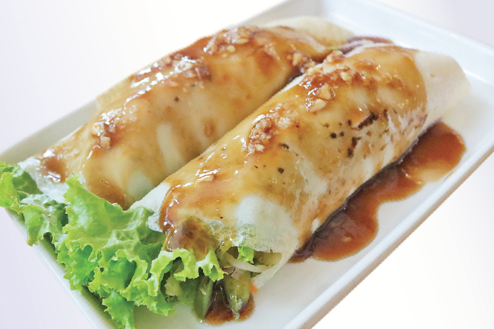 Homemade fresh lumpia wrapper stuffed with shrimp, pork, shredded cabbage, carrots, kangkong stems, and Baguio beans; served with lumpia sauce and chopped fresh garlic.