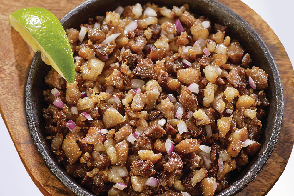 Tenderized chopped pork face tossed in onions and soy-vinegar-calamansi sauce.