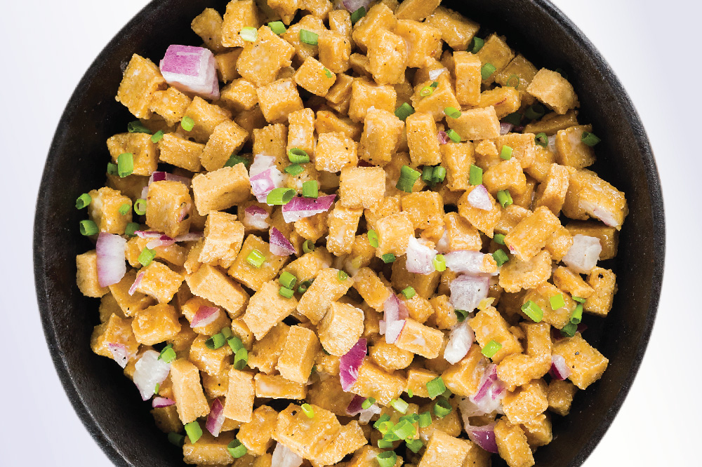 Diced tofu in a special soy sauce and mayonnaise dressing. Parang sisig pero tofu!